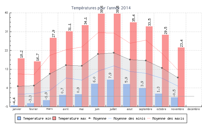 | novembre | -0.5 °C | 4.9 °C | 23.4 °C | 12.7 °C | 9.0 °C | 3.2 km/h | 40.2 km/h | SSE |
