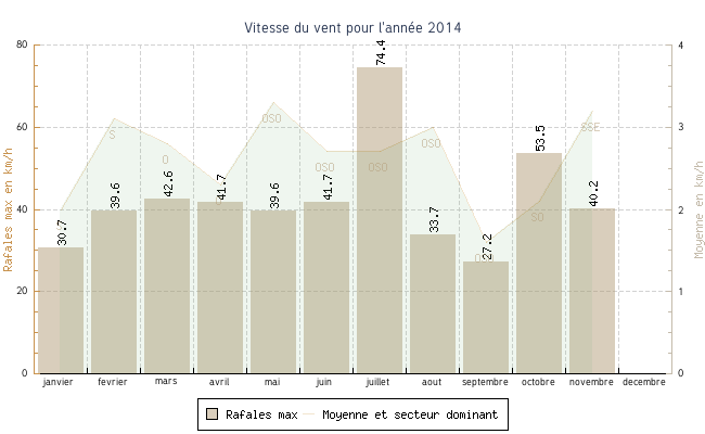 | juillet | 7.9 °C | 14.6 °C | 39.6 °C | 30.4 °C | 20.8 °C | 2.7 km/h | 74.4 km/h | OSO |